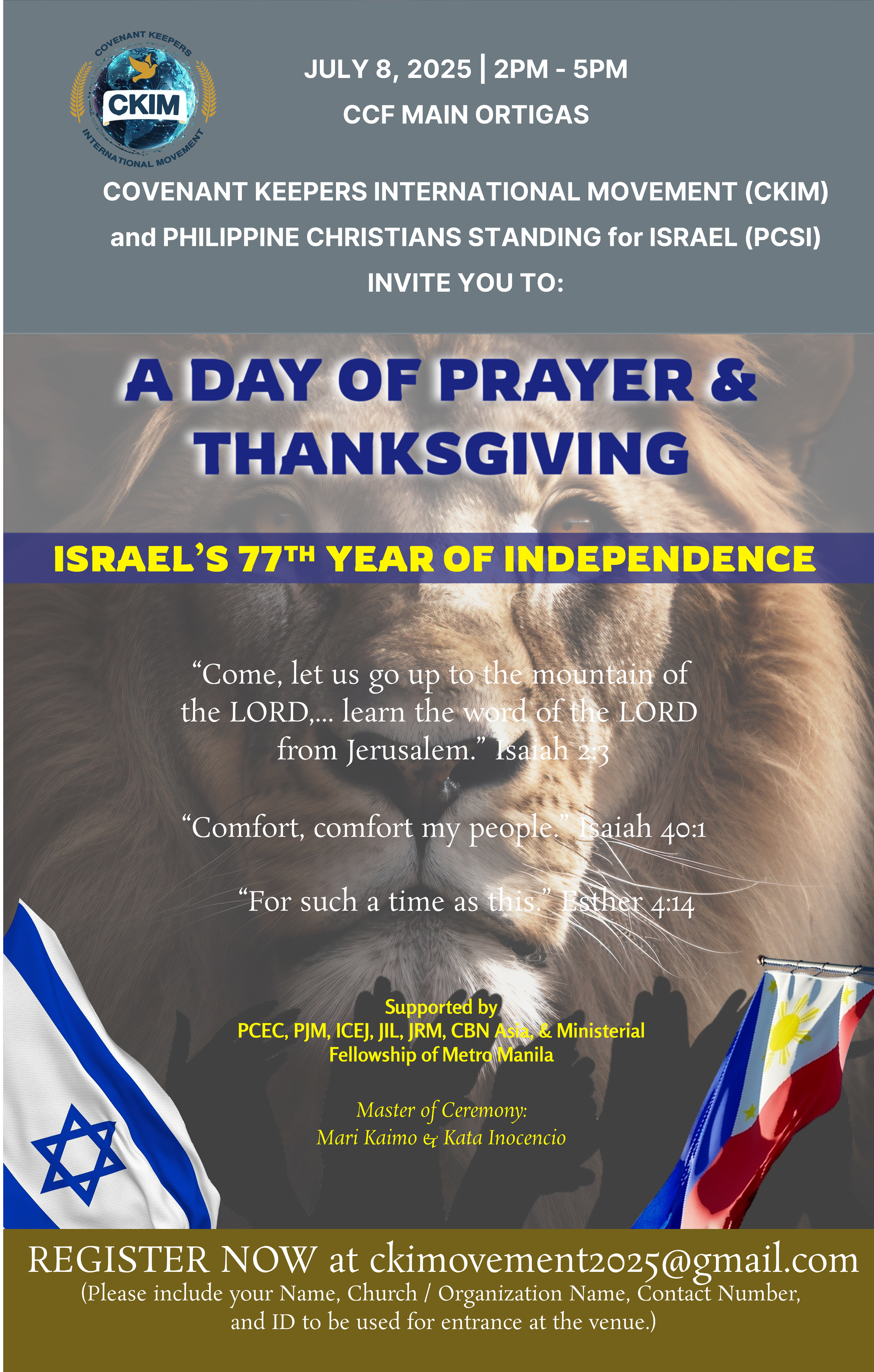 CKIM is a movement of prayer, education, and advocacy that strengthens the spiritual and cultural bonds between the Philippines and Israel. We mobilize believers to stand in covenant with God’s promises for His people.